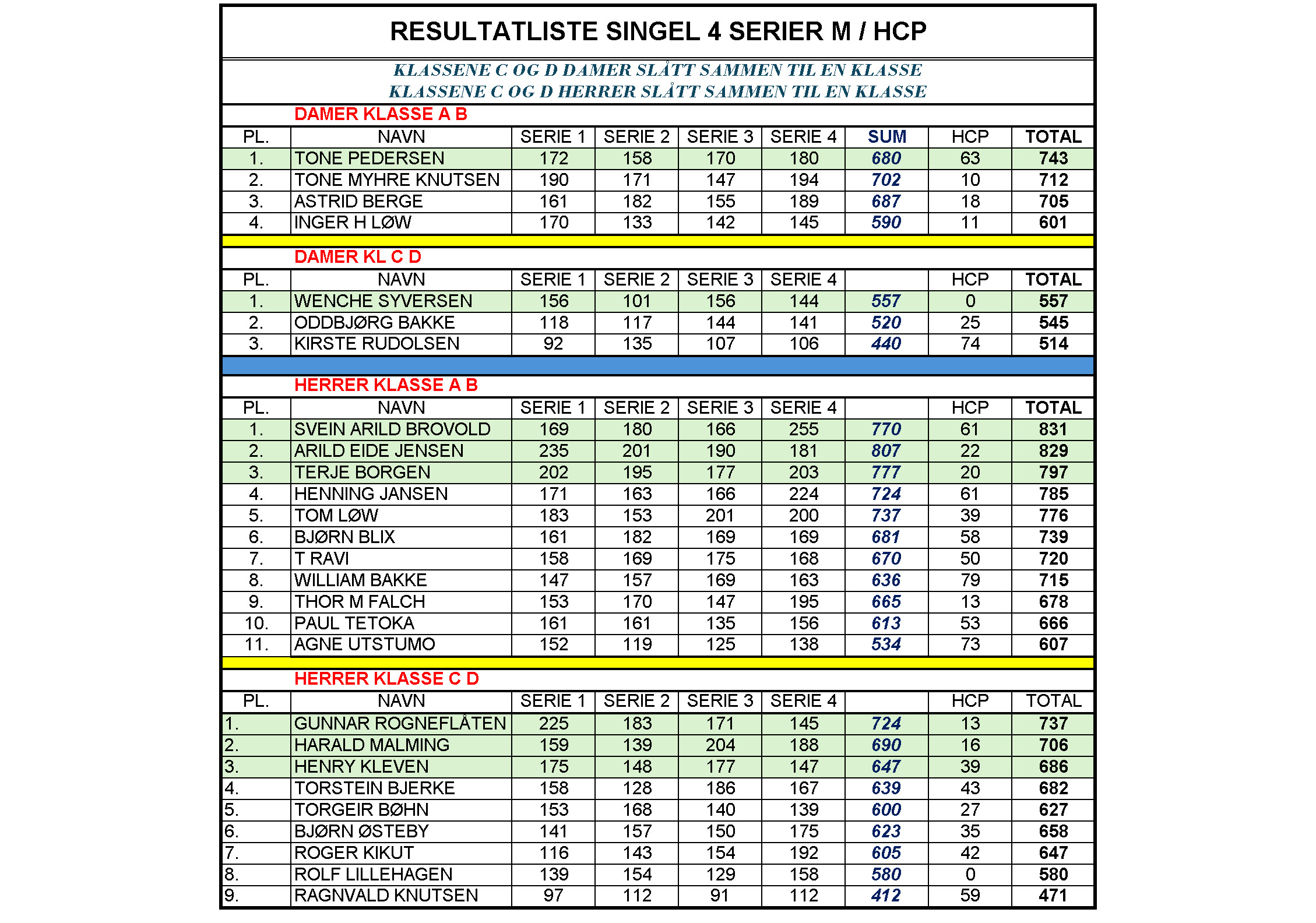 Her er dagens resultater fra Singel 4 serier m/ hcp