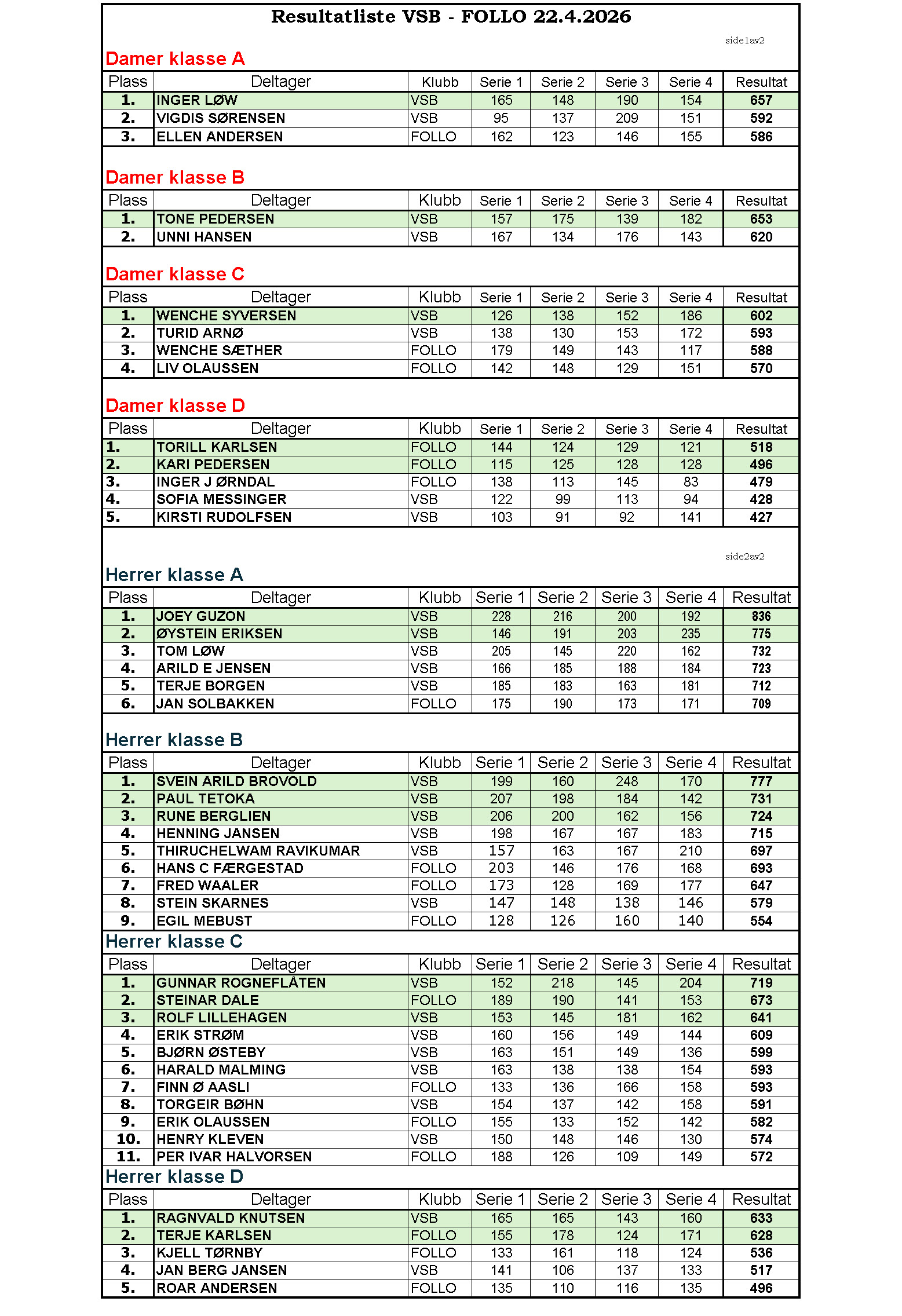 RESULTATLISTE VSB - FOLLO 22 APRIL 2026