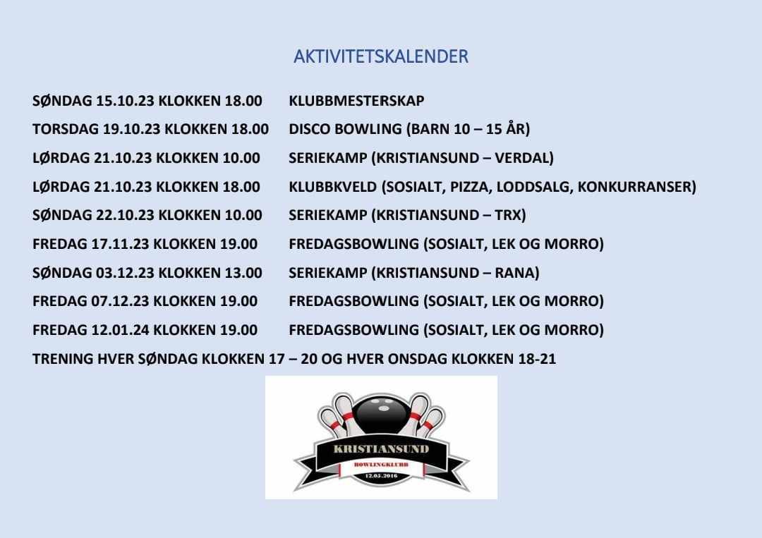 Her ser dere en oversikt over hvilke arrangement som er planlagt utover høsten. Vi setter stor pris på innspill og håper vi ser dere både på treninger, klubbkvelder og hjemmekamper. Mvh Styret Kristiansund bowlingklubb