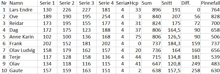 Ti stk prøvde seg på nytt laminat og Main Street som oljeprofil i kveldens utsatte månadscup. Lars Endre opna forsiktig, men tok etter kvart kontrollen i kampen og sjølv om Ove gjorde ein kjempeserie til slutt så heldt det med god margin for bankmannen.