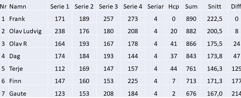 Etter dei tre første seriane var det Olav, Olav Ludvig og Dag som såg ut til å kjempa om toppen, men ein solid sluttspurt av underteikna med 257 og 273 gjorde veg i vellinga.
