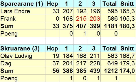Spararane (Lars Endre og Frank) fekk stryk av Skruarane (Olav Ludvig og Dag) i kveldens opningskamp i duoturneringa til Gaute. Etter to seriar stod det likt i poeng og pinnefall, men Dag hadde ein god dag :) og fekk Olav Ludvig med seg på ein solid sluttspurt. Dermed sikra dei seg 3 poeng mot Spararane sitt eine.