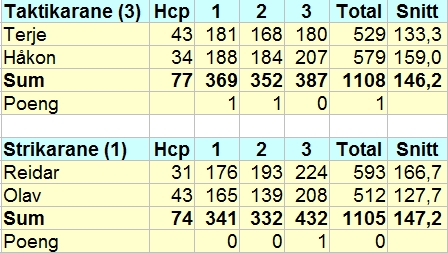 Kampen mellom Strikarane og Taktikarane var særs jamn og vart avgjort i tiarruta i både første og andre serien. I avslutningsserien tok Reidar og Olav kommandoen, men sjølv med ein solid sluttspurt kom Strikarane 3 pinnar for kort til å ta totalen.