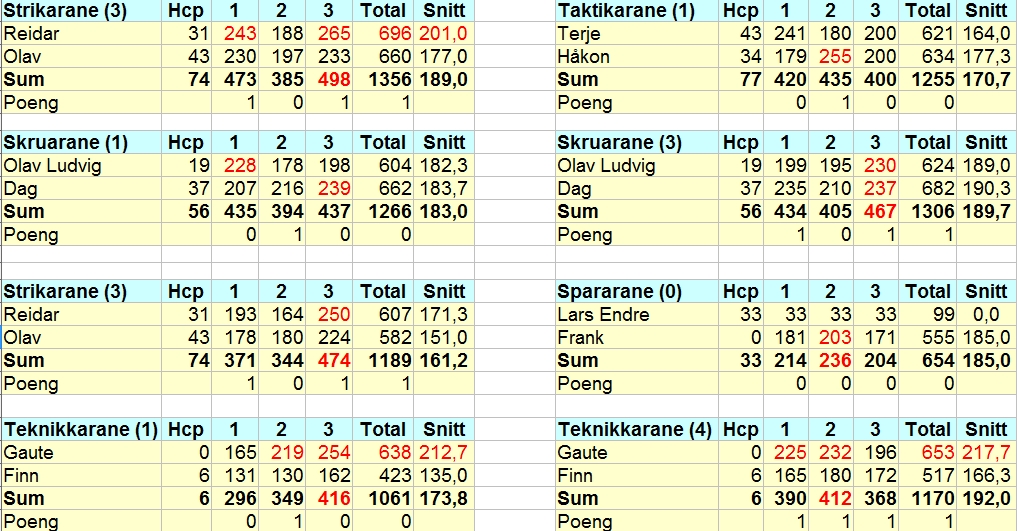 Som lag var det Strikarane med Reidar og Olav som absolutt imponerte mest i kveld. Dei vann begge sine kampar 3-1 og ligg no á poeng med Skruarane (Dag og Olav Ludvig) på 2. plass. Taktikarane (Håkon og Terje) fekk som sagt overnatta på topp, men måtte ta til takke med eitt fattig poeng i dagens kamp.