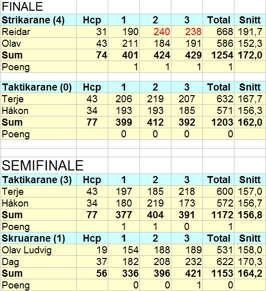 I semifinalen mellom Taktikarane og Skruarane (Olav Ludvig og Dag) vart det ein særs jamn kamp der Taktikarane drog det lengste strået med 19 pinnars overvekt på totalen.