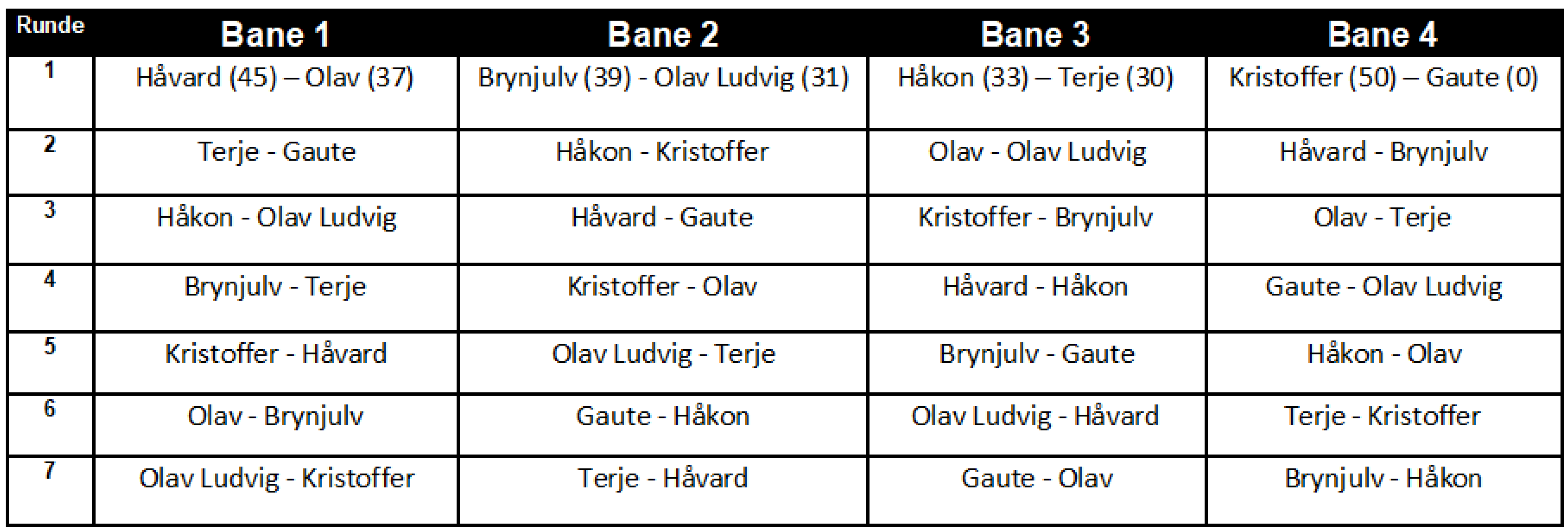 Då er kvaliken til Kjegletrimmen over. Og for eit race det vart siste dagane - ikkje scoremessig, men i kampen om å få flest kort. Olav Ludvig låg bra an før siste kvalikdag og klarte å halda Gaute på avstand. Sidan desse to karane har stått for meir enn ein tredel av dei totalt 149 korta, er det berre rett og rimeleg at begge får plass i finalen. Bra jobba guttar! Med totalt 14 deltakarar vert det premiering til dei tre beste i finalen. Vedlagt bilete viser kampoppsettet i finalen med jusertert hcp i parentes.