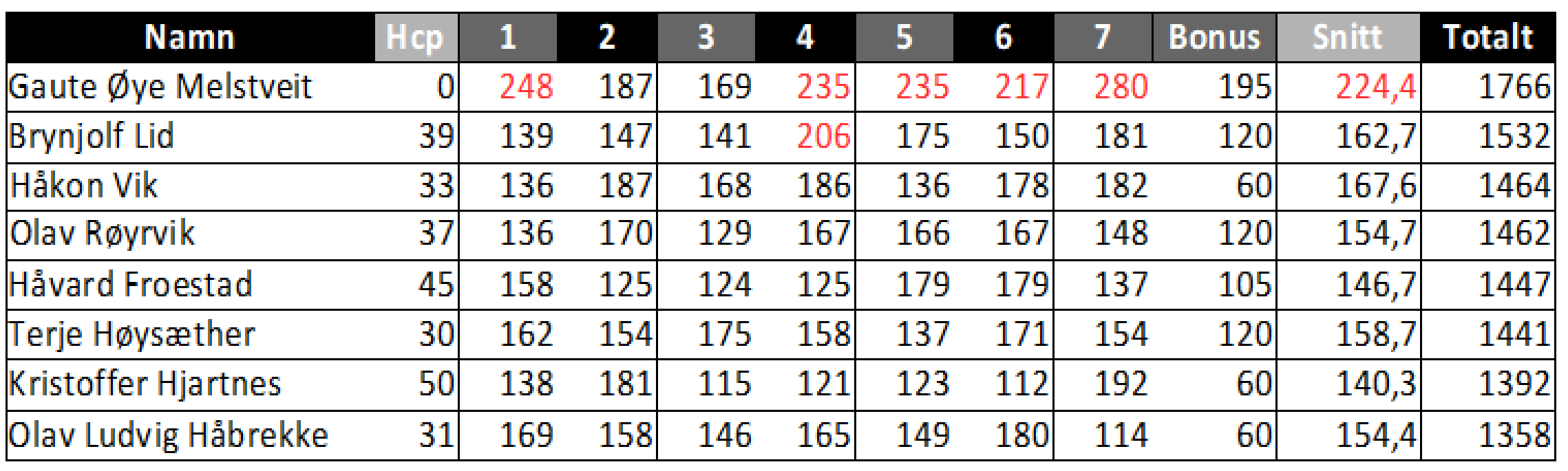 Gaute Øye Melstveit var suveren i dagens finalespel i Kjegletrimmen og han avslutta like godt med ny banerekord på bane 3. Med over 224 i rein score vart det 234 poeng ned til Brynjolf Lid på 2. plass. Håkon Vik sikra seg 3. plassen to poeng framom Olav Røyrvik.
