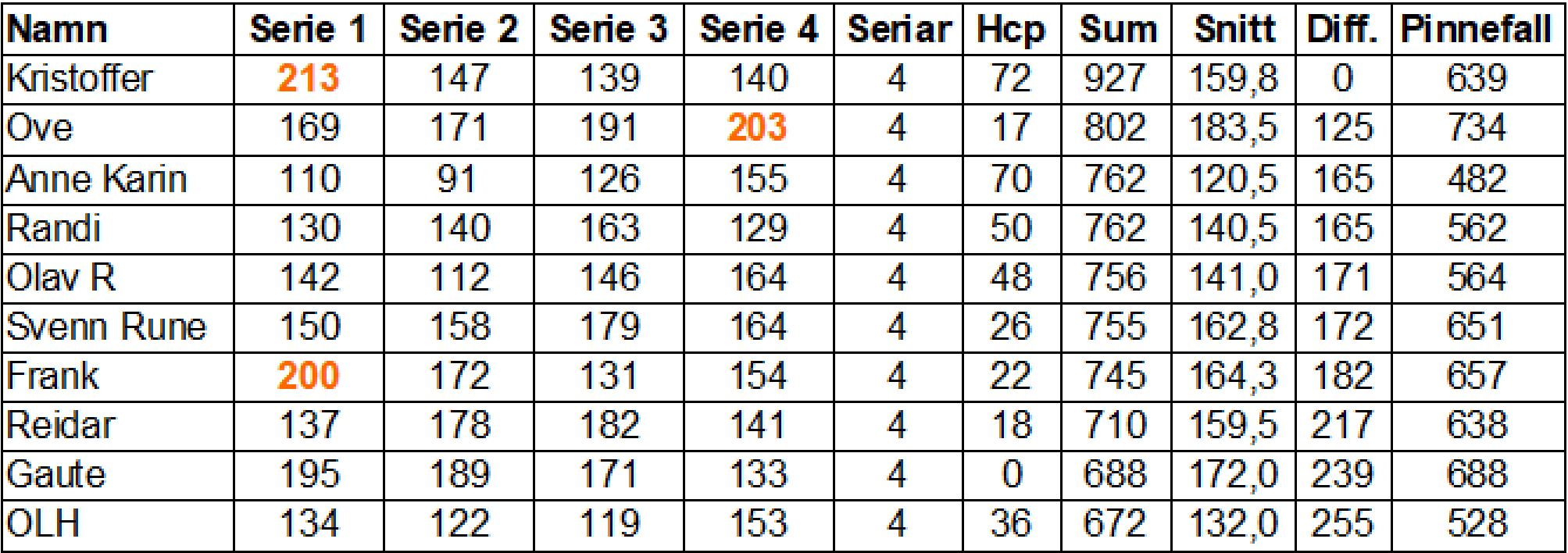 Ti stk stilte til start. Kristoffer var i ein klasse for seg og stod også for kveldens høgste score utan hcp. Me gratulerer. Ove vart nr 2.