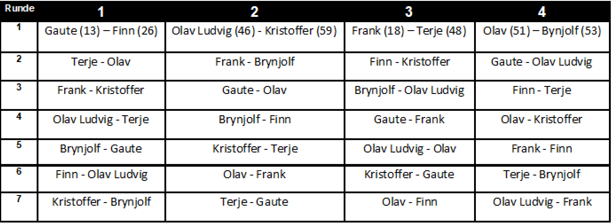Åtte spelarar har kvalifisert seg for finalen i Kjegletrimmen. Over her ser du kampoppsettet der alle skal møte kvarandre i ein kamp. I tillegg til pinnefallet vil vinnaren i kvar kamp på 30 bonuspoeng (RR-finale). Den som har flest poeng/pinnar tilslutt stikk av med potten.