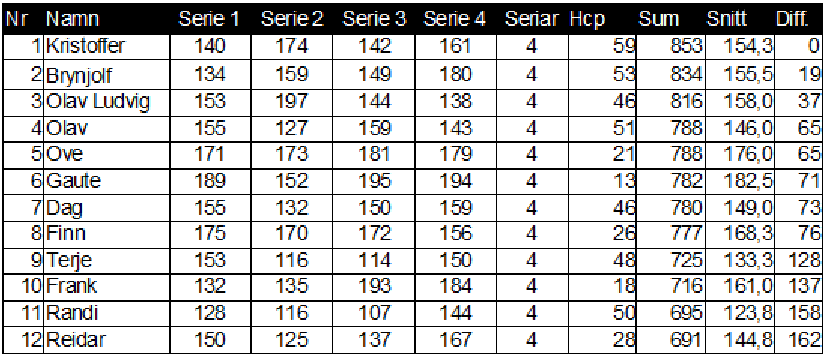 Kristoffer Hjartnes tok tredje nappet i månadscupen og sikra seg dermed pokalen til odel og eige. Brynjolf Lid vart nr 2. Det vart spelt på den vanlege månadscupprofilen, men det var mange som sleit i kveld. Ikkje ein einaste 200-serie i rein score seier litt. Neste månadscup vert utan mange av seniorane då det er same helga som veteran-NM på Hamar.