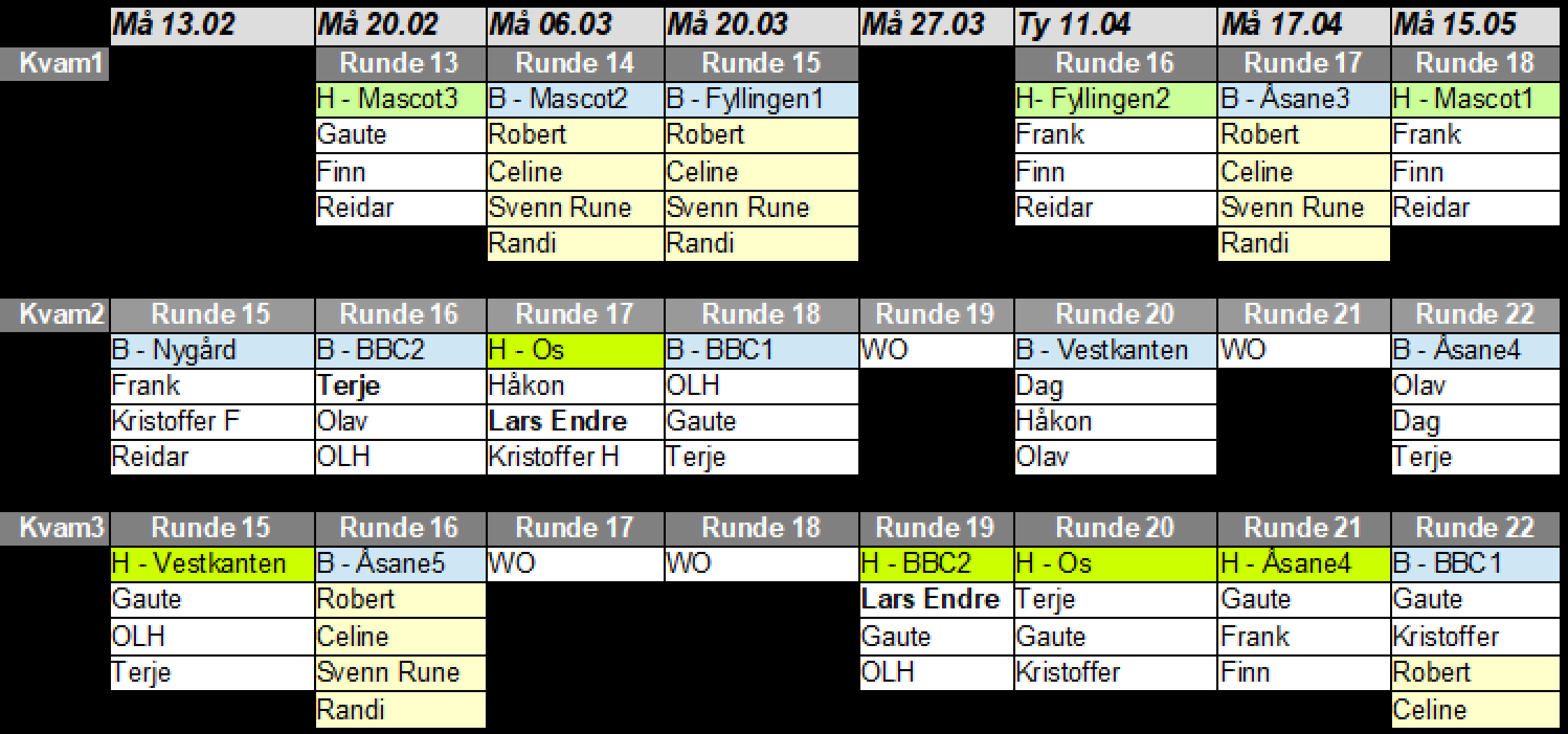 Underteikna tok på seg å stå for laguttaka resten av sesongen som ein test. Meininga er at alle lisenspelarar i klubben sender melding til underteikna om korleis deira kalender er framover og at eg dermed kan ta ut laga basert på dette.