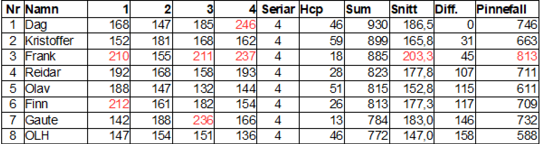 Åtte stk stilte til start og det var levert ein god del flotte seriar. Kristoffer hadde taket på pokalen etter tre seriar, men Dag ville det annleis og avslutta med 246 i rein score og sikra dermed napp i pokalen.