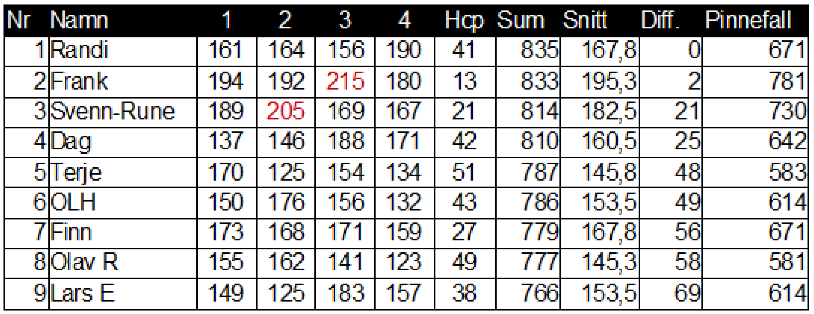 Det vart ein jamn batalje i kveldens månadscup. Randi avslutta med ein kanonserie, lurte underteikna med to pinnar og fekk første napp i ny månadscuppokal. Frå og med neste månad vert månadscupen ei turnering registrert i Norges bowlingforbund og truleg auka til 6 seriar, men vandrepokalen vert framleis hovudpremien.