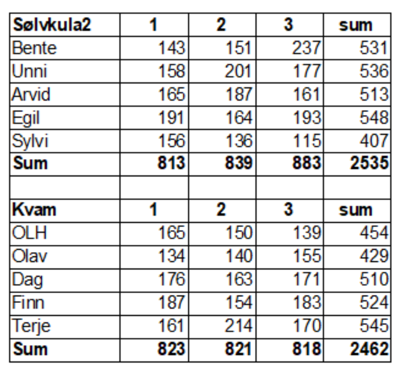 Det tar visst litt tid å få koordinert løysinga med registrering av resultat for veteranligaen, men ein kikk på livescoren till både Kvam og Sølvkula via Lanetalk, viste at Kvam truleg fekk med seg 1 poeng. Førsteserien vart vunne med 10 pinnar medan serie nr 2 gjekk til Sølvkula2 med 18 pinnars margin før kvemmingane vart overkøyrt i sisteserien. Neste veke er det Trondheim3 som er motstandar.