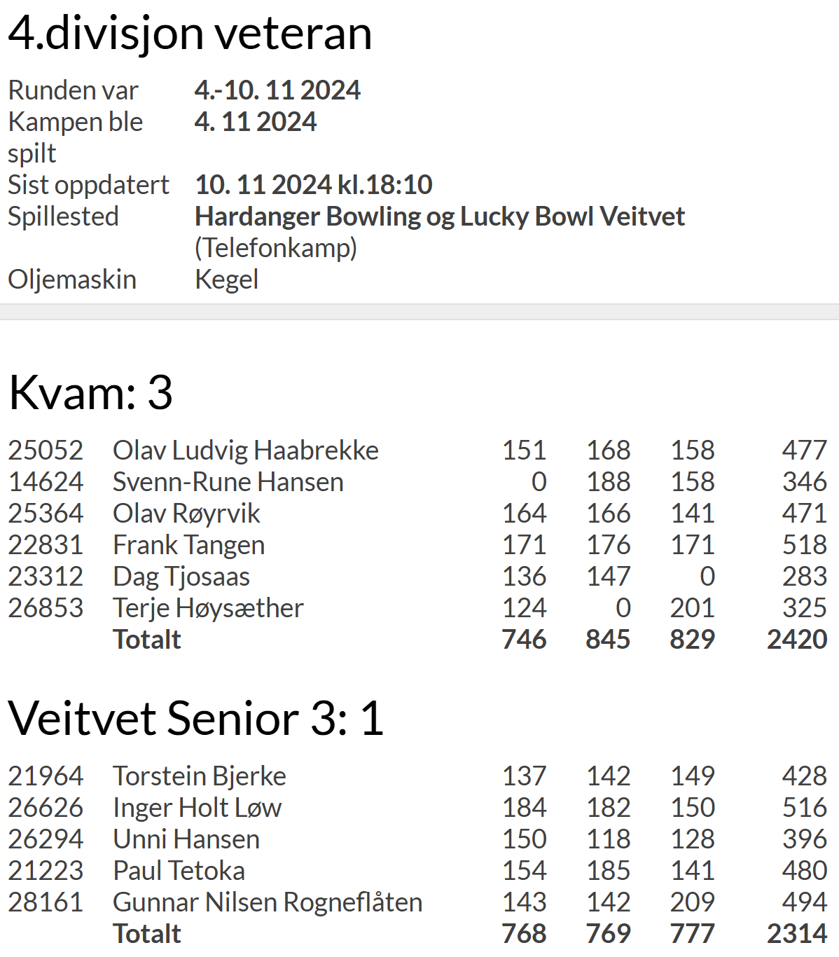 På ein heller dårleg dag henta me nok pinnar til å slå botnlaget i divisjonen. Men me må finna ein betre profil å spela på. Carbon (42 fot) skal visst vera enkel, men opplevest ikkje slik i hallen vår. Onsdag møter me også svak motstand på papiret. Lillehammer har eit lagsnitt på 156 til no.