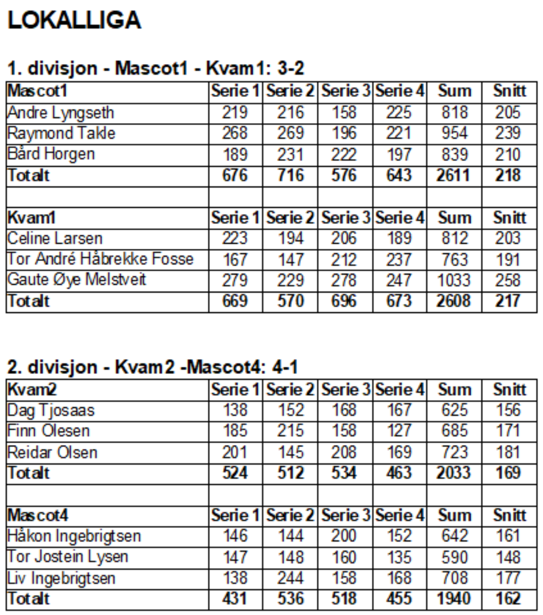Andrelaget vårt tok imot Mascot4 i Øystese. Før runden låg Mascot på 2. plass, men etter å ha blitt sabla ned 4-1 skifta laga plass, så no ligg Kvam2 på opprykksplass. Ut frå scoren kan det sjå ut som om dei fleste spelarane sleit med å finne den gode linja. Reidar vart best av våre med 723 på 4 seriar (181 i snitt).