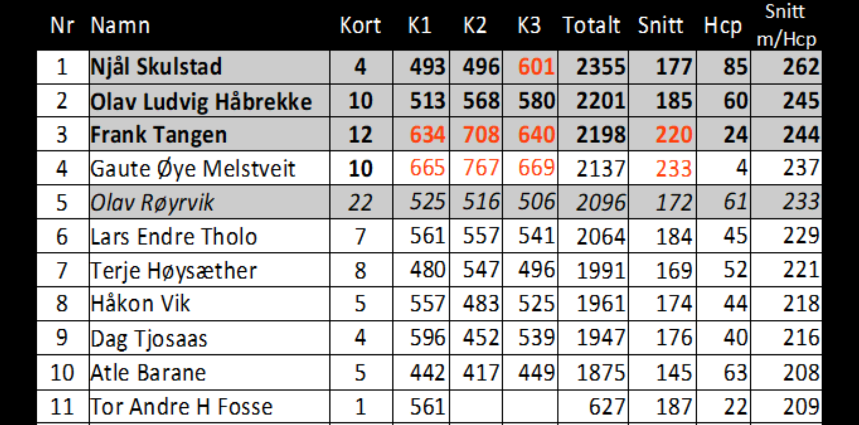 Det vart spelt 88 kort i årets Kjegletrim og det må reknast som bra. Premiepotten er dermed på kr. 4.400 som skal fordelast på pallplassane etter finalen sundag 5. januar kl. 14. Der skal dei tre beste i kavliken (Njål, Olav Ludvig og Frank) + den med flest spelte kort (Olav) duellere i ein RR-finale. Det vert ein kamp mellom kvar av spelarane (3 seriar). Hcp vert med som tidlegare og det vert 30 ekstrapoeng for kvar siger. Vedlagt ligg resultatet i kvalifiseringa.