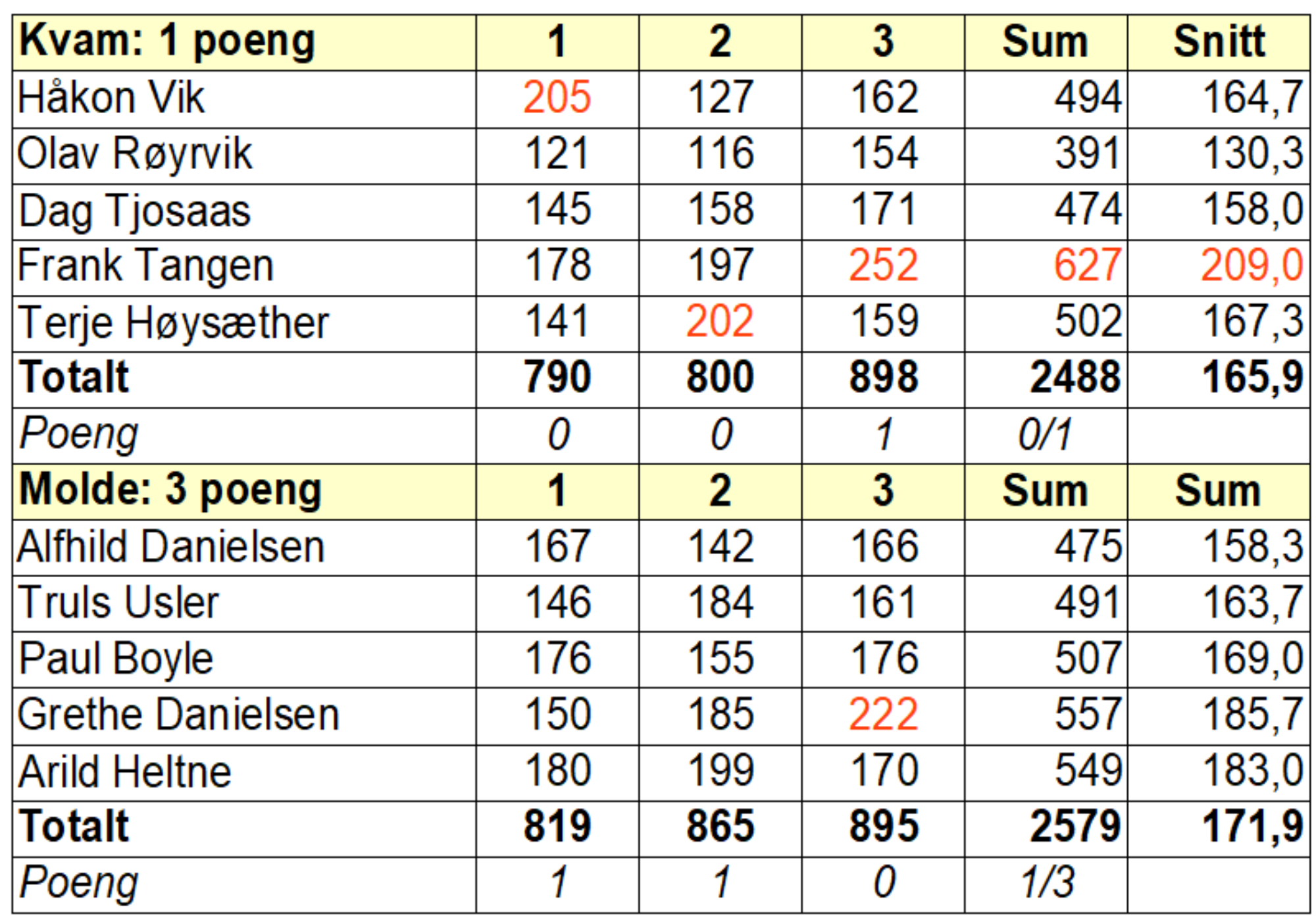 Både Kvam og motstandar Molde hadde forsiktige opningar i denne rundens veterankamp. Me opna med 790 mot Molde sine 819. I runde 2 løfta me oss litt og enda på 811 medan Molde jobba seg opp på 865. I sisteserien var begge laga tett på 900, men me slo Molde med 3 pinnar; 898 på oss og 895 på Molde. Dermed enda kampen 3-1 til romsdalingane.
