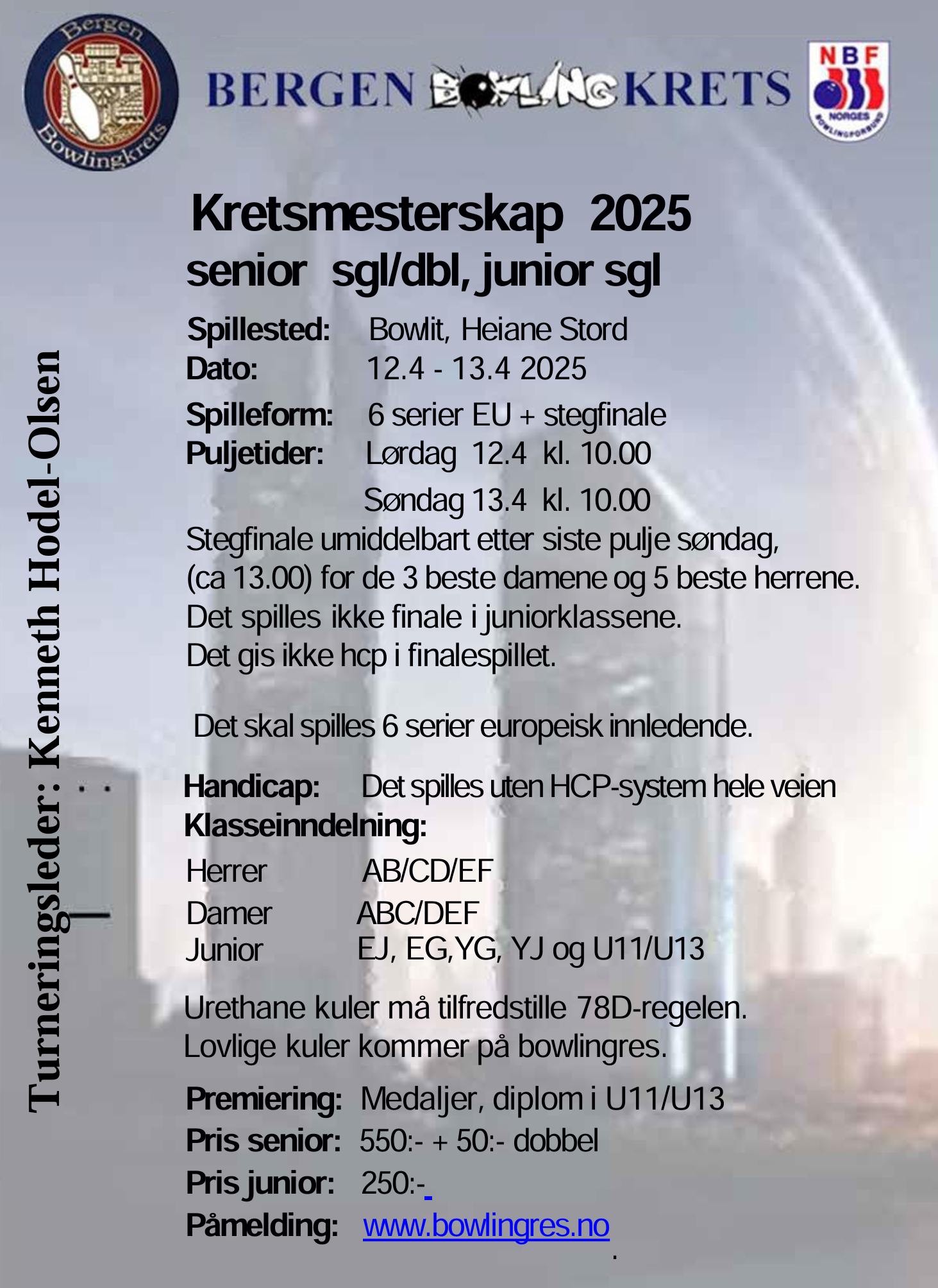 Påmeldinga til kretsmeisterskapen 2025 for singel og dobbel er no lagt ut på bowlingres. Det er mogeleg å spela laurdag 13. april eller sundag 14. april. Sundagen er nesten fullbooka i skrivande stund. Finn deg ein dbl-partner og hiv deg frampå.