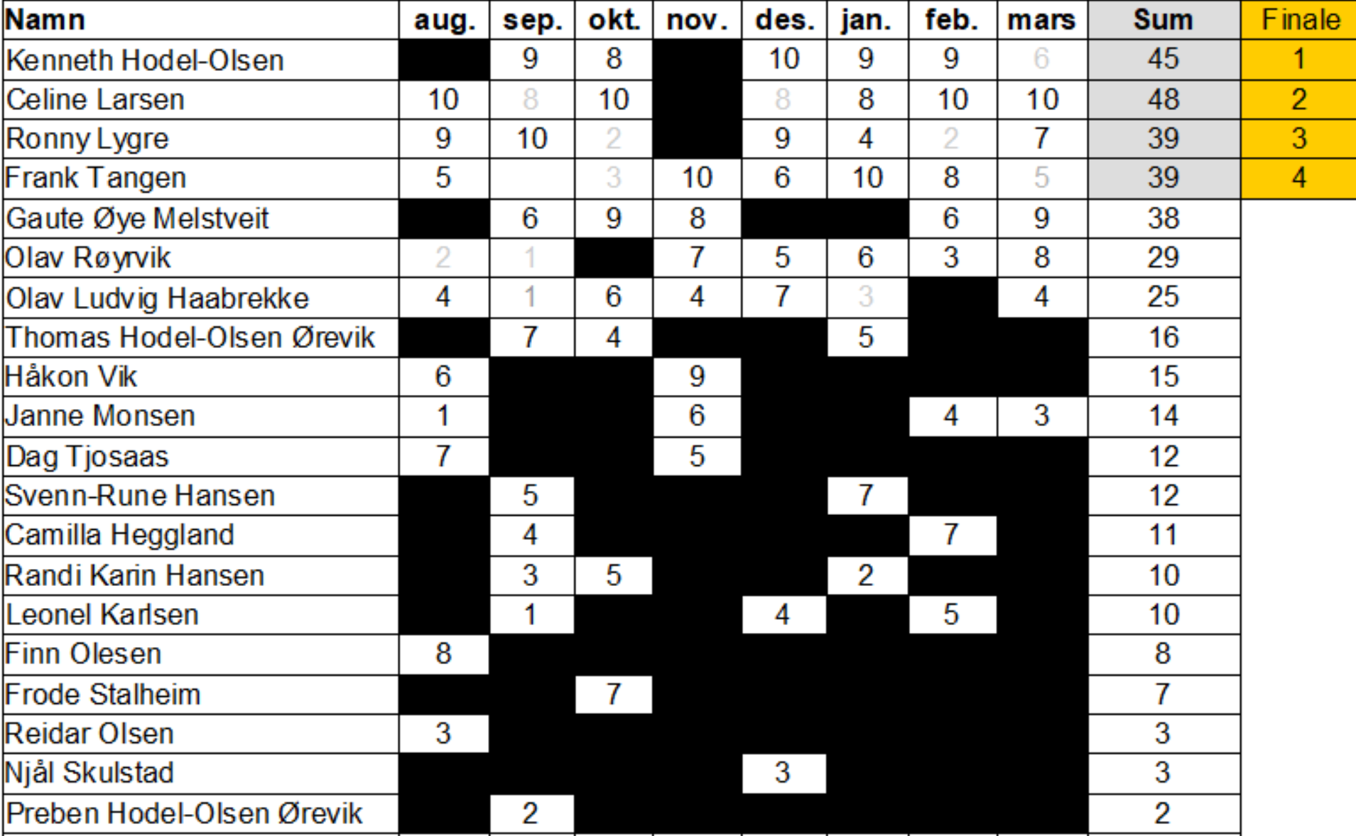 I dag vart den siste runden av 5'er cupen spelt og for 4. gong toppa Celine cupen. Celine og Hodel har vore klare for finalen ei stund, medan underteikna, Ronny og Gaute kjempa om dei to siste plassane. Med siger i dag ville Gaute gå vidare, men den gjekk som sagt til Celine. Med 2. plass til Gaute var han avhengig av at Ronny blei maks nr. 5 i dag, men åsane-karen sikra seg 4. plassen med ein god sisteserie og med det finaleplass.
