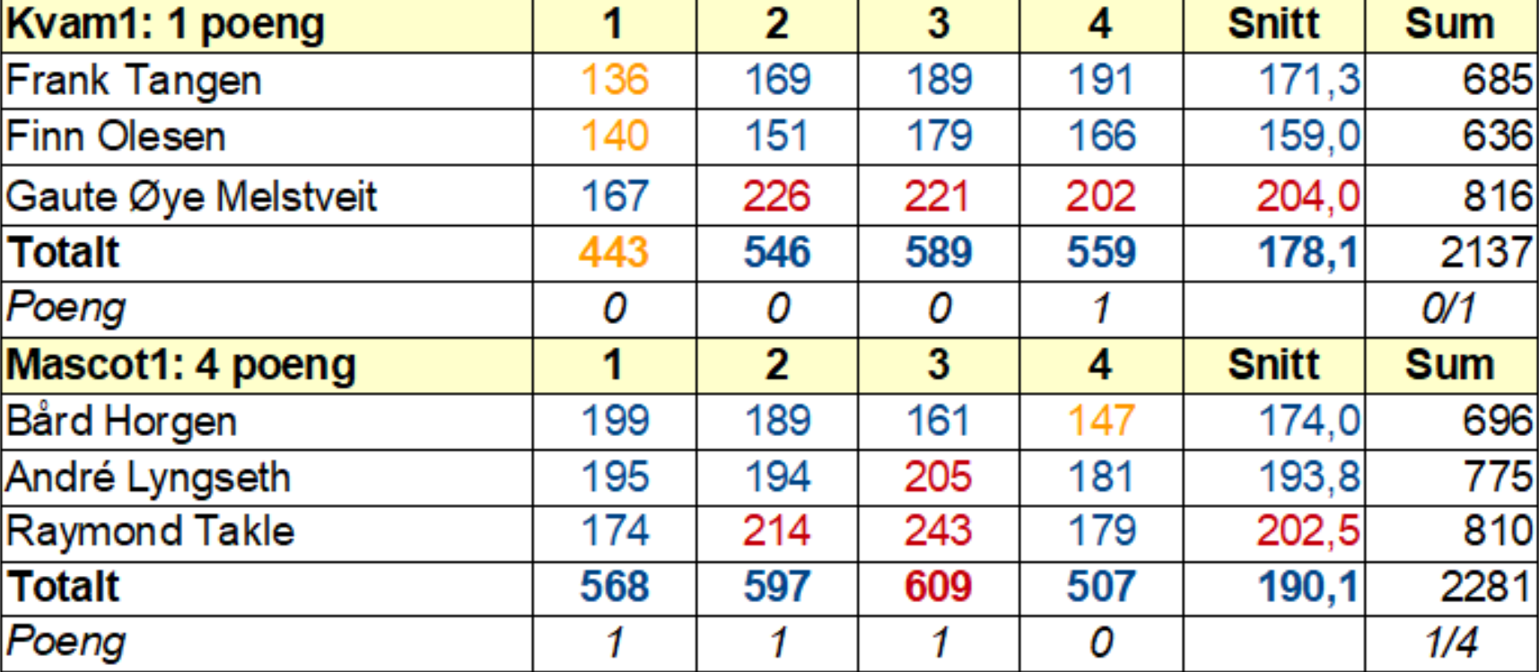 Førstelaget vårt gjekk på ei ny blemme på heimebane i kveldens framskutte lokalligakamp. Atter ein gong var det eit av Mascot-laga som lurte oss. Denne gongen brukte me ein "snill" husprofil, men det gjekk likevel ikkje vegen. Mange sparemiss over heile linja både for heime- og bortelaget, men Mascot-laget var minst dårleg. Gaute vart bestemann med totalscore på 816 (204 i snitt).