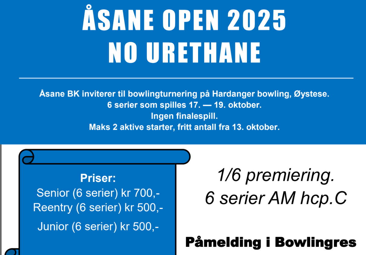 Frå 17. til 19. oktober vert turneringa Åsane open arrangert, men denne gongen i vår hall. Det vert spelt seks seriar utan finalar. Puljer fredag kl. 17, laurdag og sundag kl. 11 og 1330. Det er Åsane bowlingklubb som er arrangør, men me stiller sjølvsagt med mannskap for drift av hallen.