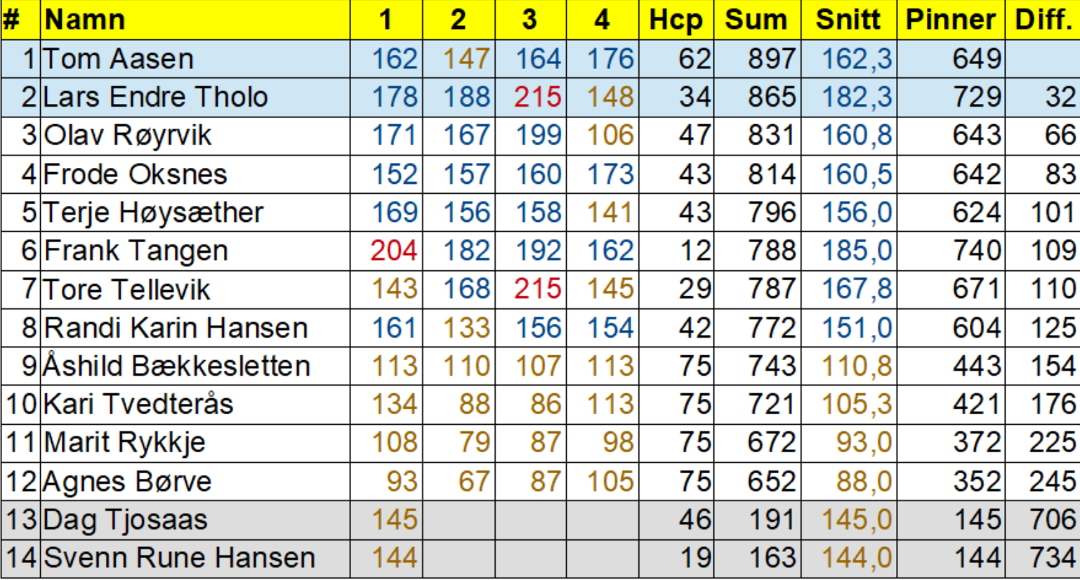 Heile 14 spelarar stilte til start, men banefeil på bane 1 gjorde at Dag og Svenn-Rune hoppa av for å fikse banen. Me andre komprimerte oss på dei resterande banane og stod på til krampa tok oss. Tom var den som heldt best på trykket og sikra seg 1000-lappen. Lars Endre fekk 2. premie på kr. 400.