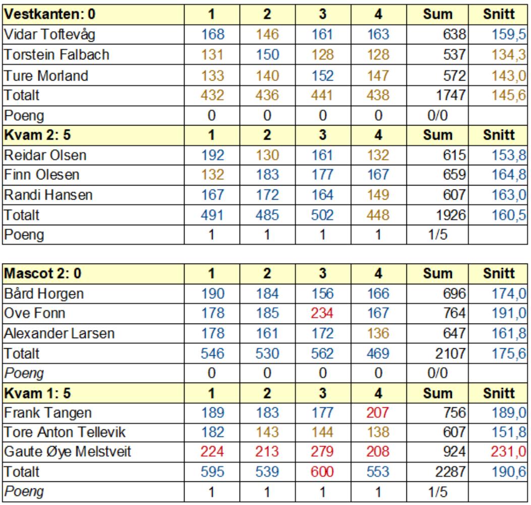 Gaute vart igjen dagens mann med kanonsterke 924 på 4 seriar inkl. ein 279-serie; dette gjev eit snitt på 231 på ein profil der berre nokre få enkeltseriar kryssa 200-grensa. Status etter fire rundar er at Kvam1 leiar 1. divisjon med 4 poengs klaring til nr. 2 og Kvam2 har klatra til 5. plass a poeng med fire andre lag. På Kvam2 spelte Randi, Finn og Reidar medan Tore, Gaute og underteikna var på Kvam1.