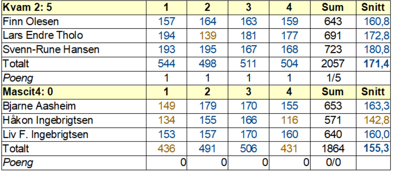 Ingen gjestfriheit å spora frå kvammalaget når Mascot sitt fjerdelag kom på vitjing. I ein til tider jamn batalje vippa det meste i heimelaget sin favør. Poeng i serie to med 7 pinnars margin og i serie tre med 5 pinnars overvekt. Men første- og sisteserien var overkøyring.