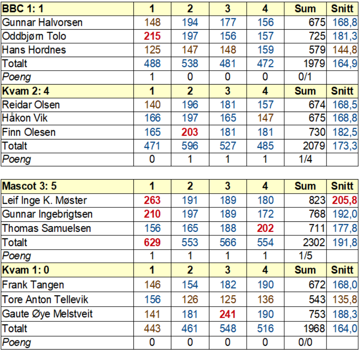 For førstelaget gjekk det skikkeleg ille. Etter å ha tapt med stygge siffer på heimebane i forrige runde vart det endå verre i kveld. Me opna grusomt alle tre i førsteserien. I andreserien fekk Tore store problem med ryggen og det såg ut til at han måtte gje seg. Han fekk litt smertestillande slik at han klarte å slita seg gjennom kampen. Faktisk var me hakk i hel på Mascot i dei to siste seriane sjølv med 2,5 mann på laget.