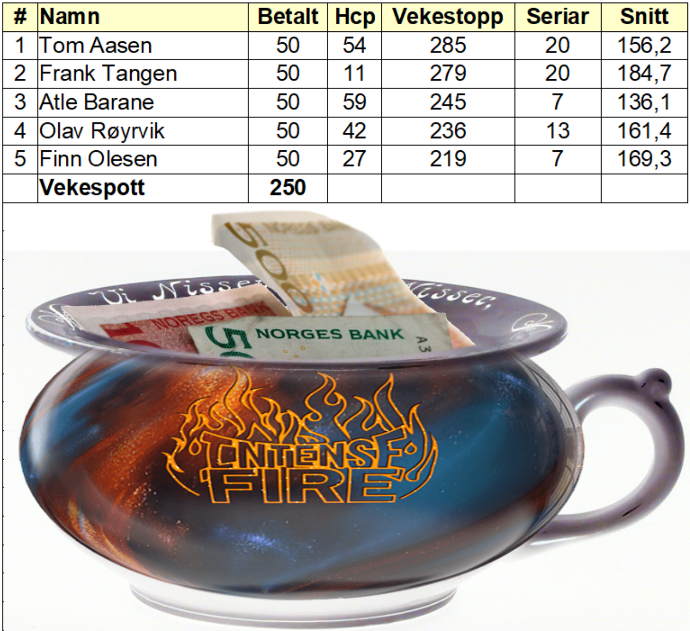 Denne vekespotto ser det ut til at Tom drar i land. I kveld spelte han fem seriar på Voss og fekk 231 i rein score i serie 2. Med hcp vert det 285. Så her er det skikkeleg utfordring for dei som vågar seg frampå.