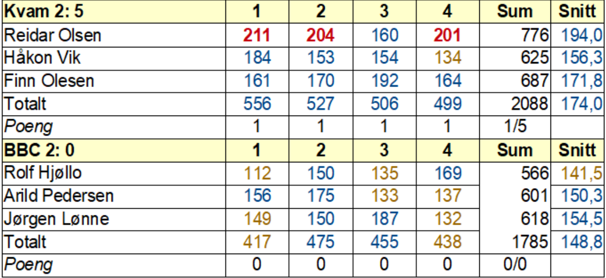 Andrelaget vårt surfar vidare på bølgetoppen. Dei har plukka 19 av 20 mogelege poeng på dei siste fire kampane og med det blanda seg inn i tetstriden i 2. divisjon. Reidar var dagens mann med tre 200-seriar og 194 i kampsnitt - sterkt!