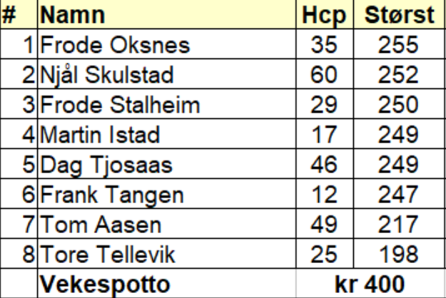 Åtte spelarar har førebels meldt seg på den nye vekespotto, og det vart spelt høge seriar både på Voss og i Øystese opningsdagen. Etter totalt 52 spelte seriar skil det berre 8 pinnar mellom toppresultata til dei seks beste spelarane. Tenker me satsar på ein freddan i Øystese for å kjempa vidare.