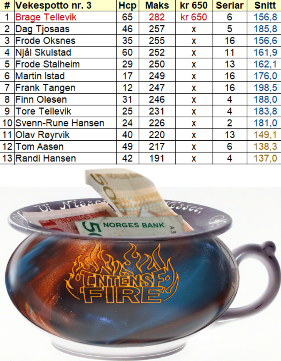 Oooops! Freddan vekte vekespotto verkeleg til liv. Først var Dag ute med ny bestenotering på 211 i rein score og 257 inkl. hcp. To pinnar meir enn Frode O. Så fekk me eit par til med på vekespotto og yngstemann Brage smelte like godt til med ein 217-serie. Med hcp på 65 enda pila på 282 som er den nye utfordringa når me går inn i helga.