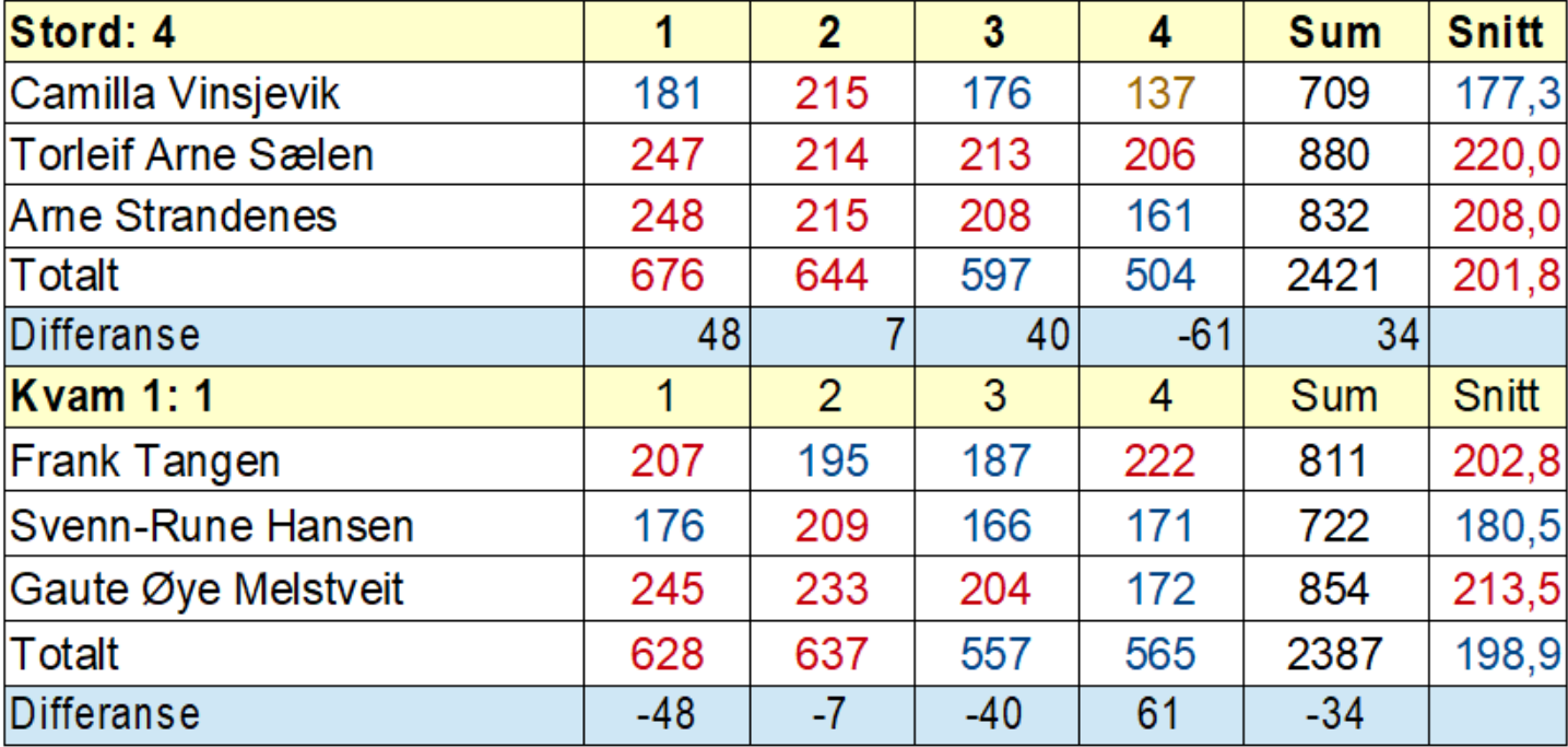Sundag spelte Kvam1 den utsatte kampen mot Stord i lokalligaen. I ein heller jamn kamp vippa det meste over til heimelagets fordel. Me møtte eit godt Stord-lag der faktisk Camilla Vinsjevik var den som imponerte mest. Ho spelte tre sterke seriar, men datt litt ned i sisteserien. Så viss me hadde vore meir på hugget kunne me ha hanka inn totalen. Men alt i alt fornøgde med vårt spel og gratulerer til stordingane med ein fortent siger!