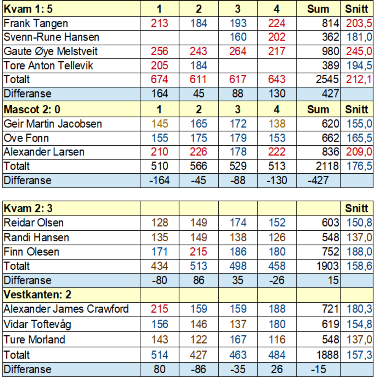 To lokalligakampar på heimebane denne runden, Førstelaget tok imot Ove sitt lag Mascot2 medan Kvam2 fekk Vestkanten på vitjing. Solid spel av førstelaget, ikkje minst av Gaute som sanka 980 pinnar (245 i snitt) på sine 4 seriar, gav smultringar på heimvegen for Mascot2. Vestkanten var nok litt meir nøgde med sin bortekamp. Det vart ein tett og jamn kamp der kvemmingane såvidt sneik seg til totalen og sigeren.