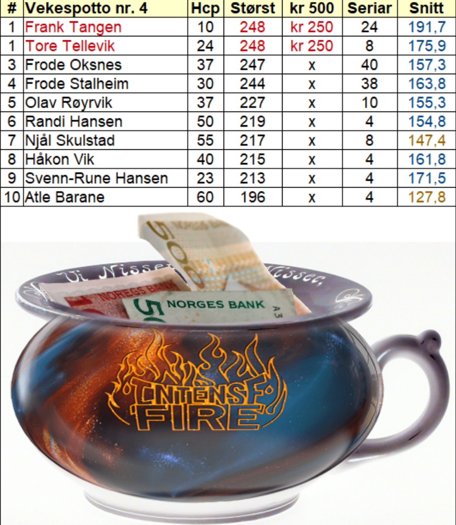 Det vart gjort særs gode forsøk på å løfta potta både i Øystese og på Voss i dag. Frank spelte 246 i Øystese, Frode Stalheim spelte sin andre 244-serie og Frode Oksnes løfta seg til 247 inkl. hcp., men ingen passerte den magiske 248-grensa. Dermed vart det delt vekespotte mellom Tore Tellevik og Frank Tangen denne runden og kr. 250 på kvar.