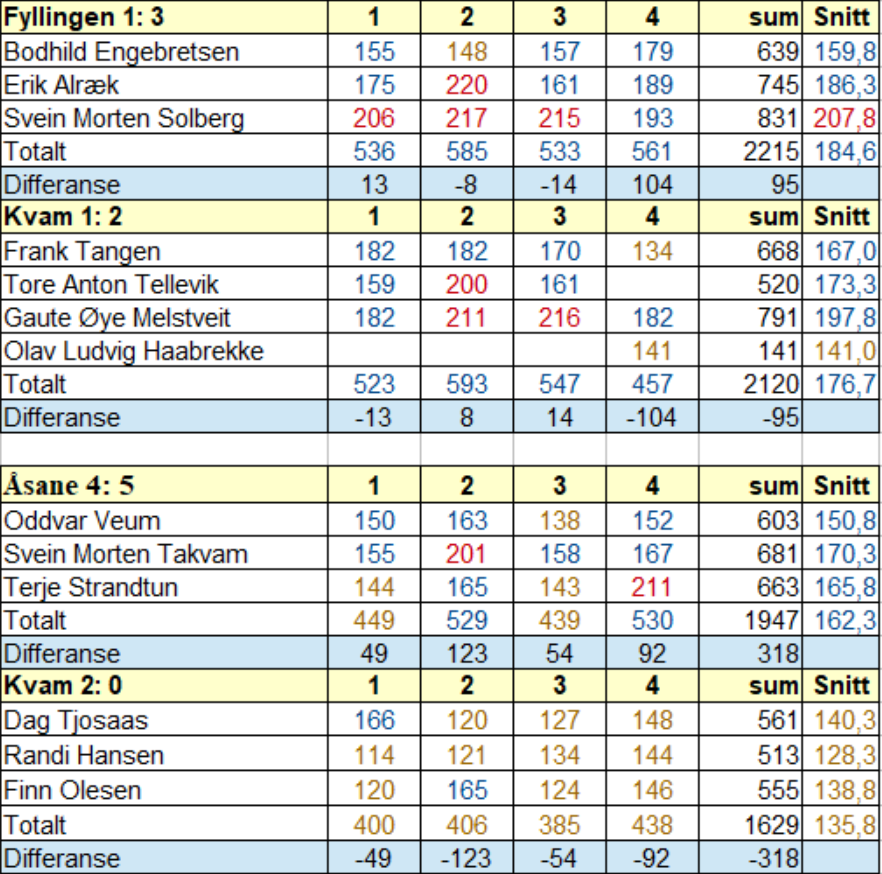 Tja, kva skal ein seia. Av 24 spelte seriar så hadde kvemmingane halvparten gull-seriar. Ein gullserie vil seia at serien er under 150 i score. Det vert ikkje mykje poeng med slikt spel, men stabilt jamt er det jo :) Andrelaget fekk den frykta smultringen og sendte Åsane4 til topps, medan førstelaget sneik seg til to poeng mot nedrykkskandidat Fyllingen1.