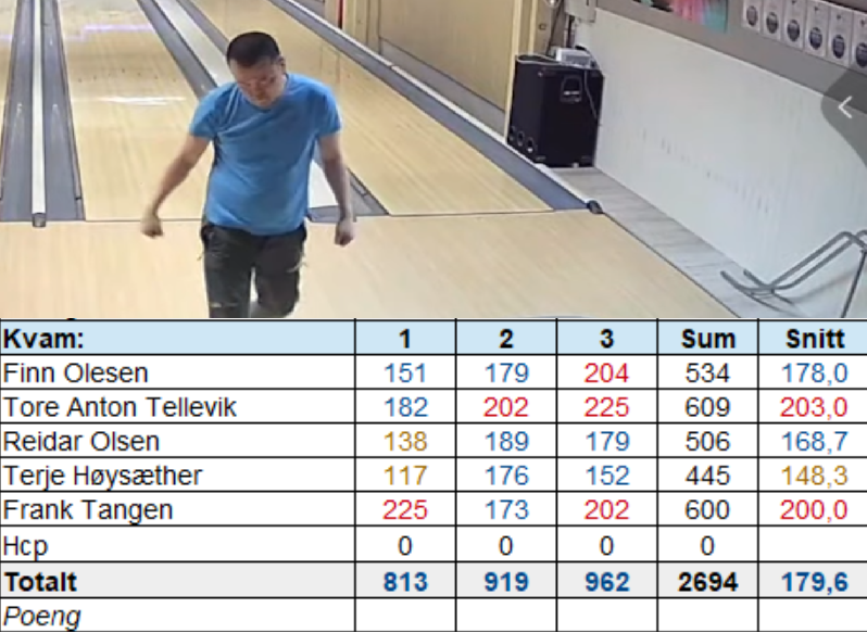 Kvam sin kamp vart overført på vår youtubekanal. Rana spelar truleg sin kamp torsdag. Me klarte også denne runden å halda oppe nivået frå sist runde mot Orkla2, så Rana må overgå seg sjølve for at ikkje me skal få poeng. Tore vart vår bestemann med 609 i totalscore og 203 i snitt over tre seriar.