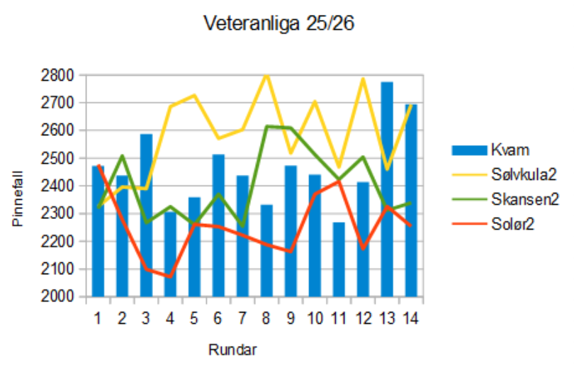 I skjermdumpen over her ser du totalscoren til veteranlaget vårt i alle dei 14 rundane me har spelt (blå kolonner). Det står 3 rundar igjen og eg har leika meg med å leggja inn diagramlinjer for dei tre motstandarane våre for å indikera styrkeforholdet. Og som de ser så er det berre Sølvkula2 som scorar jamt betre enn oss. Skansen2 har spelt ganske likt med oss medan Solør2 stort sett har hatt dårlegare score enn Kvam. Så ut frå desse tala bør me klara å redda plassen i 4. divisjon.