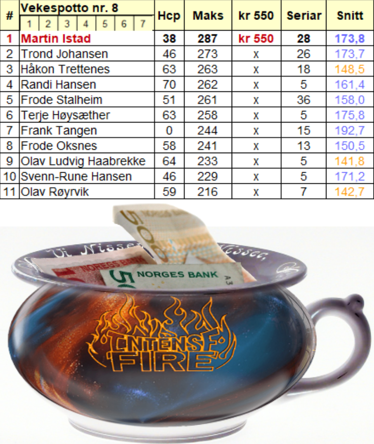 To vossingar til med på denne vekespotte. Frode O og Frode S prøvde seg på Voss, men det såg ikkje ut til å vera optimale forhold. Trond valgte ein anna taktikk: Han kasta seg med Tom på treningstur til Øystese og det betalte seg. Trond spelte eit snitt på 189 over 12 seriar og forbetra vekespotto ikkje mindre enn tre gonger; først tangerte han Randi sine 262, så løfta han seg til 270 før han enda dagen med 273.