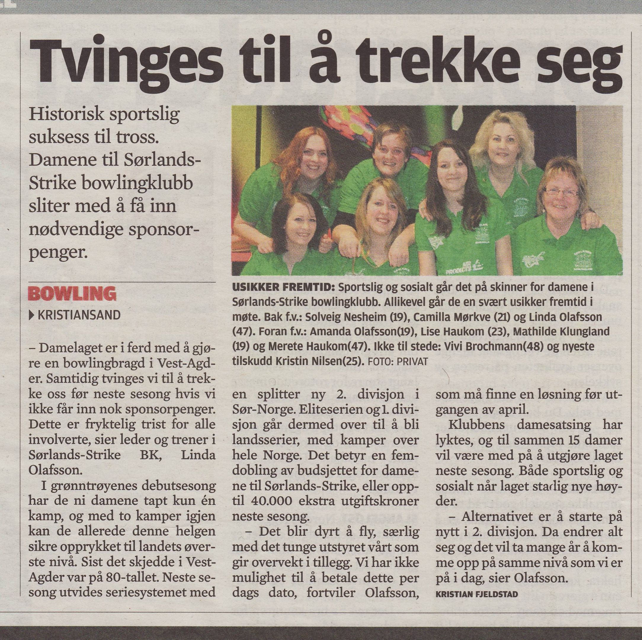 I papir utgaven fredag skrev Kristian et stykke om at Sørlands-Strike trenger sponsorpenger for å realisere videre satsing på damelaget. Eventuell opprykk eller ikke betyder ingenting, for klubben må ha flere midler. Utgiftene øker uansett om vi blir i 1. divisjon. Det er bare så synd at økonomi skal stoppe laget fra sørlandet.